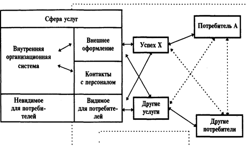 На рис.1 показаны основные элементы (аспекты) функционирования сферы обслуживания, которые включают точки соприкосновения. Представьте себе, что в ресторан заходит посетитель А. За столиками он видит других посетителей. Их поведение и выражение их лиц оказывают воздействие на посетителя А. Если у всех довольный вид, свидетельствующий о том, что им здесь нравится, посетитель А тоже почувствует себя комфортно. И напротив, если все нетерпеливо поглядывают на часы и безуспешно пытаются привлечь внимание официантов, посетитель А мгновенно насторожится. Также он обращает внимание на обстановку и на обслуживающий персонал ресторана. Кухня может остаться за пределами его непосредственного восприятия, если не находится за стеклянной перегородкой.