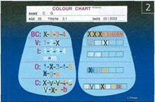 В третью очередь определяется интенсивность, классифицируемая по четырем группам, по следующим формам: пятна, облака, снежинки и горизонтальные полосы. Эти группы расположены в Таблице Цветов для лучшей классификации. Белые насыщенные пятна находятся в областях гипоминерализованной эмали и встречаются на зубной ткани детей и молодых людей. В Таблице Цветов для классификации этой формы указаны номера 1, 2, 3 и 4; буквы W-M обозначают оттенки белого, существующие у натуральных зубов: W - холодный белый, М - более теплый молочный оттенок. Предлагаемые массы для воспроизведения этих оттенков: IW (холодный белый) и IM (теплый белый). Интенсивность может присутствовать во всех трех областях зуба (шейка, средняя часть, резцовая часть).