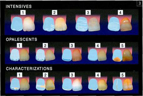 В четвертую очередь определяется опалесценция. Опалесценция зависит от призматической структуры эмали, которая определяет феномен внутреннего отражения и указывает короткие волны света, отвечающие за серо-голубые эффекты, типичные для резцового участка. Номера 1, 2, 3, 4 и 5 относятся к группам, разделяющим формы опалесценции; с ними необходимо сверяться при определении цвета. B-G-A относится к оттенкам опалесценции натуральных зубов: В (голубой), G (серый) и А (янтарь). Массы составов для воспроизведения: ОВ (голубой), OG (серый) и ОА (янтарный). Опалесценция встречается только в резцовой трети зуба (межпроксимальная и граничная области).