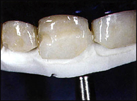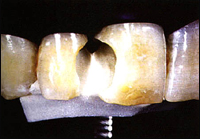 При построении дентинного тела первый слой дентина должен обладать более сильной насыщенностью, чем базовый. Это необходимо, потому что предстоящее нанесение эмали сильно понизит внутреннюю хроматическую силу. Дентинное тело должно создать внутренний хроматический состав с десатурацией от шейки к резцовой области и от небной - к вестибулярной области. Этого можно достичь, используя сегментную стратификацию трех различных оттенков: от двух верхних к завершающему нижнему. Если верхний оттенок обозначен как 1, стратификация должна начинаться от цервикальной границы полости с UD3; затем необходимо нанести UD2, частично достигая резцовой области; затем UD1 покрываются все дентинные слои и резцовая область, где моделируются дентинные маммелоны. Это законченное дентинное тело покрывается тонким слоем Glass Connector. При необходимости получения характеристик дентинного тела (1 и 2) или границы (3) необходимо использовать массы белого цвета (OW, IW) или янтарного цвета (ОА).