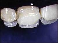 . Просвеченная реставрация с очевидной опалесценцией резцов и соотношением световой текстуры, сходным с естественным зубом. |