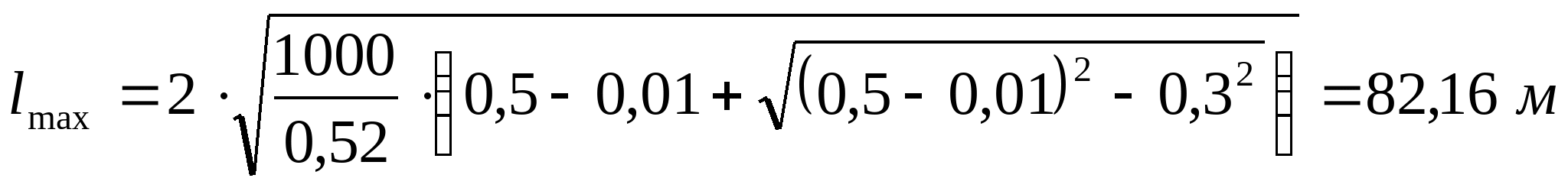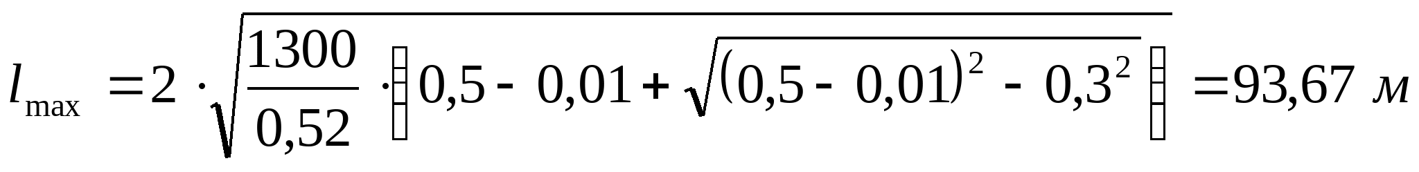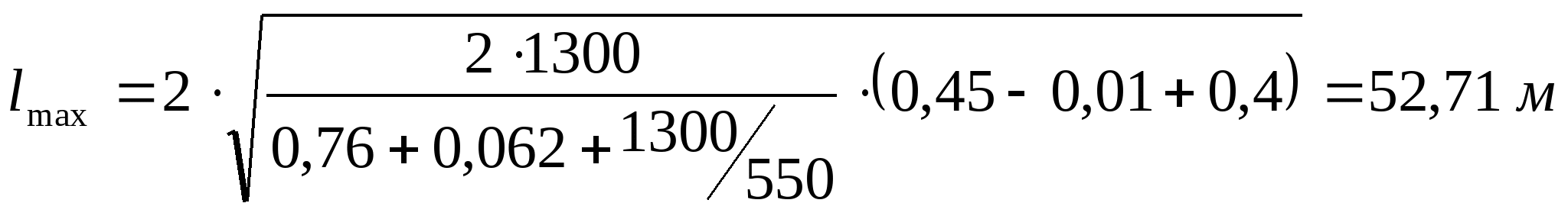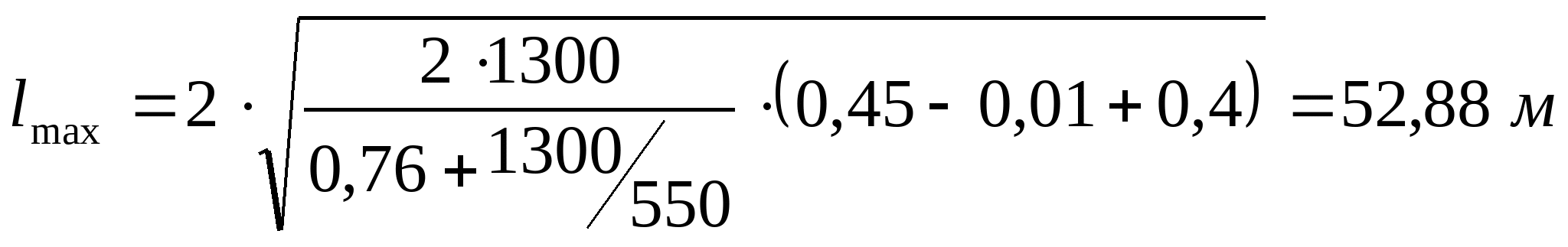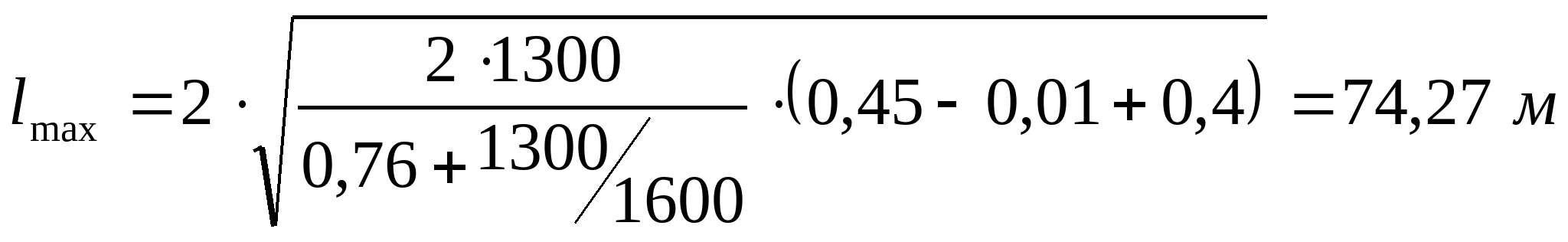 , (3.13)  Главные пути станции и перегона РЭ=0  Из условий токосъема принимаем lmax=70 м. Перегон. Насыпь h<5 м. Прямая РЭ=0  Из условий токосъема принимаем lmax=70 м. Перегон. Насыпь h>5 м. Прямая РЭ=0  Из условий токосъема принимаем lmax=70 м. Прочие пути. Станция. Прямая. РЭ=0  Из условий токосъема принимаем lmax=70 м. Перегон. Насыпь h<5 м. Кривая R1=550 м. РЭ=0  lmax<70 м, находим РЭ. Средняя длина струны в середине пролета:  Удельная эквивалентная нагрузка:  при    Принимаем lmax=52,71 м Перегон. Насыпь h<5 м. Кривая R2=1600 м. РЭ=0  Из условий токосъема принимаем lmax=70 м.