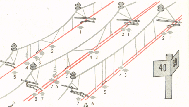 контактные провода: БрФ-100 | Расстояние между контактными проводами: — (мм) Конструктивная высота контактной подвески: 2,2 (м) Тип консолей: изолированные Количество изоляторов подвесной гирлянды: 3 Вариант схемы станции: 3 Вариант для трассировки контактной сети на перегоне: 3
