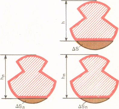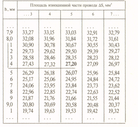 Измерение высоты сечения провода. Высоту оставшегося сечения контактного провода измеряют универсальным микрометром, комплектом измерительных скоб или индикаторным прибором с точностью до 0,01 мм. Результаты замеров заносят в Книгу состояния контактного провода дистанции контактной сети (форма ЭУ-85), где указывают дату замеров, номера опор, номера струн по счету километров и т. д. При двух контактных проводах записи замера ведут дробью: в числителе -левого, в знаменателе — правого провода относительно счета километров независимо от номера пути и направления движения поездов по нему. Значение высоты сечения контактного провода 8 мм и менее записывают в книгу красными чернилами. Высоту сечения контактного провода измеряют у каждого фиксирующего зажима, в середине пролета, у питающих и стыковых зажимов, а также в точках с повышенным местным износом провода. Последовательность и места измерений указаны на рисунке цифрами. В том случае, когда сделаны замеры с каждой стороны от зажима (всех типов), записывают меньшее значение высоты сечения провода. При шахматном расположении звеньевых струн измерения выполняют у зажима одного провода и рядом, в середине межструнового пролета второго провода. На отходящих нерабочих ветвях сопряжений анкерных участков высоту сечения провода не проверяют. Рисунок 7.1 – Последовательность замера высоты сечения контактного провода Определение износа контактного провода. На основании замеров отдельно для каждого анкерного участка определяют среднее арифметическое значение высоты hср сечения контактного провода: , (7.1) где n — число замеров. При этом замеры на вставках не учитывают. В случае двух контактных проводов подсчет ведут раздельно для левого и правого провода: , (7.2)  По среднему значению высоты провода, пользуясь таблицей износа для данной марки контактного провода (табл. 7.1), определяют среднюю площадь ΔS изношенной части каждого провода анкерного участка. Таблица 7.1 – Таблица износа контактного провода Например, для средней высоты провода hср = 8,45 мм марки МФ-100 средний износ составит ΔS = 27,2 мм2. При двух контактных проводах среднюю площадь изношенной части определяют как сумму площадей износа левого и правого провода. Например, при hср.л = 8,96 мм по табл. 7.1 ΔSЛ = 21,55 мм2; при hср. п =9,13 мм ΔSп =19,74 мм2. Средний износ двух проводов ΔScp = ΔSЛ + ΔSп = 41,29 мм2. Из нос контактного провода в пролете характеризуется коэффициентом неравномерности износа Кн, который определяют делением среднего износа провода в середине пролета ΔSср пр на средний износ провода у фиксатора ΔSф анкерного участка. По результатам измерений определяют участки провода, износ которых превышает допустимые пределы. Такие участки подлежат обязательной замене.