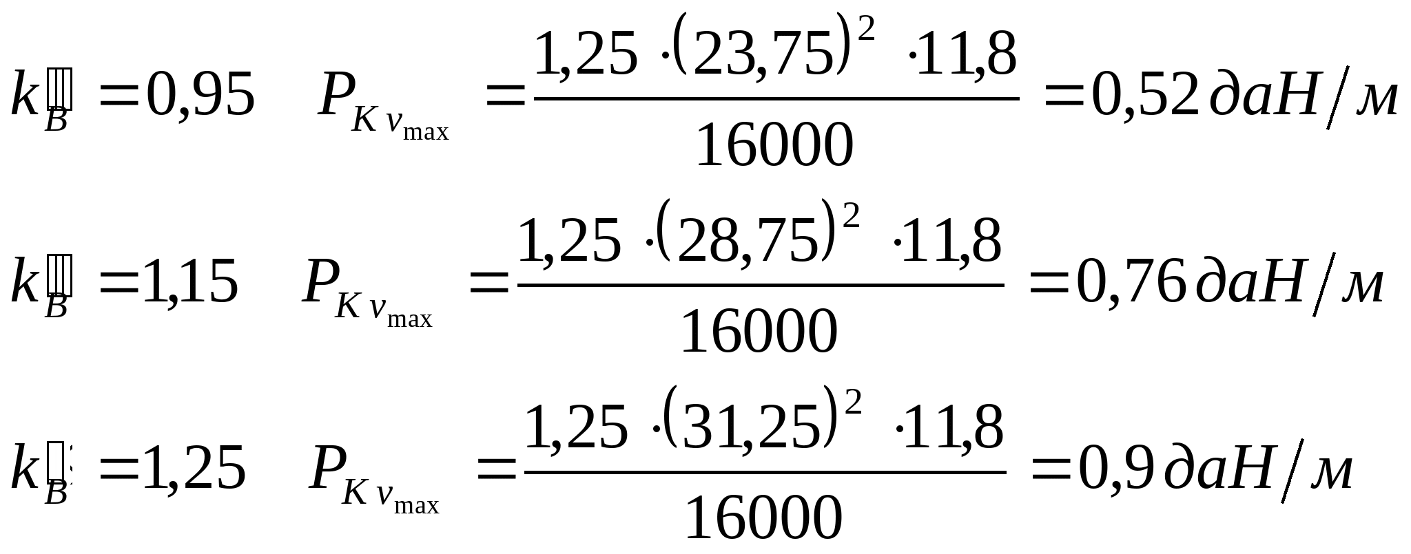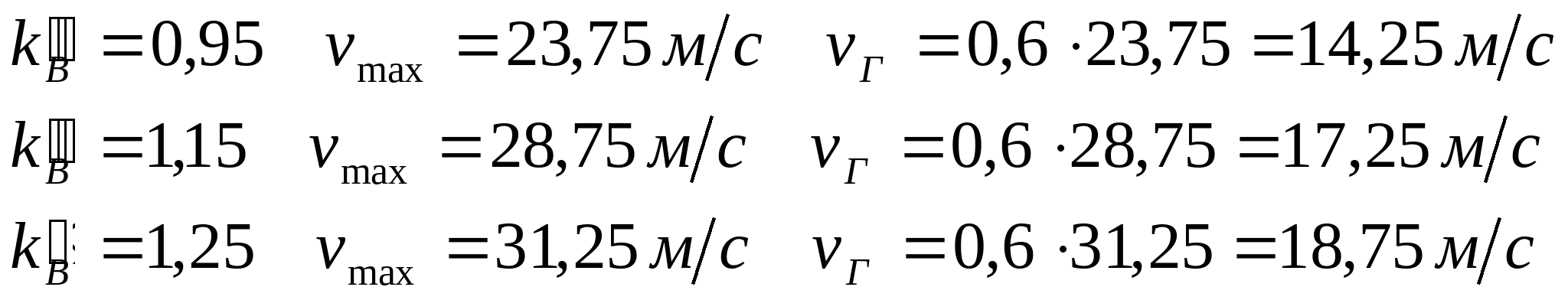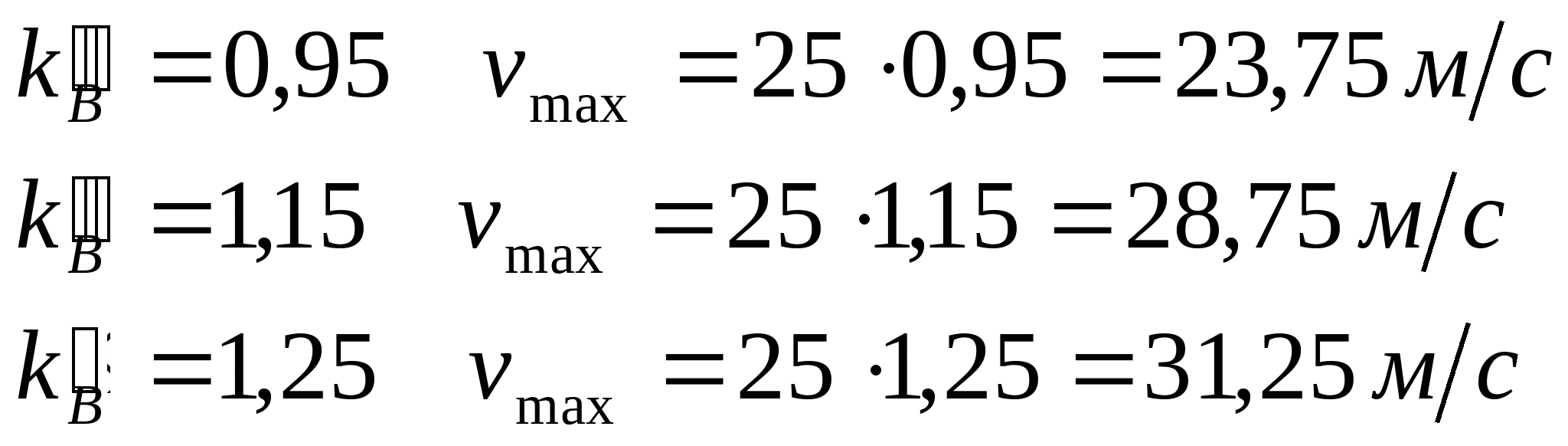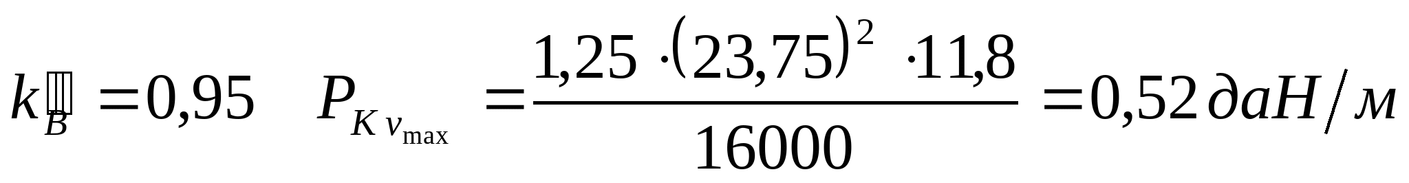 Нахождение расчетного режима Режим максимального ветра. Ветровую нагрузку на контактный провод в режиме максимального ветра, даН/м находим по формуле: , (3.1) где – аэродинамический коэффициент лобового сопротивления контактного провода; – максимальная скорость ветра, м/с; – высота сечения контактного провода, мм. Максимальную скорость ветра м/с находим по формуле: , (3.2) где – нормативная скорость ветра, м/с;  – коэффициент, учитывающий порывистость ветра и микрорельеф местности.
