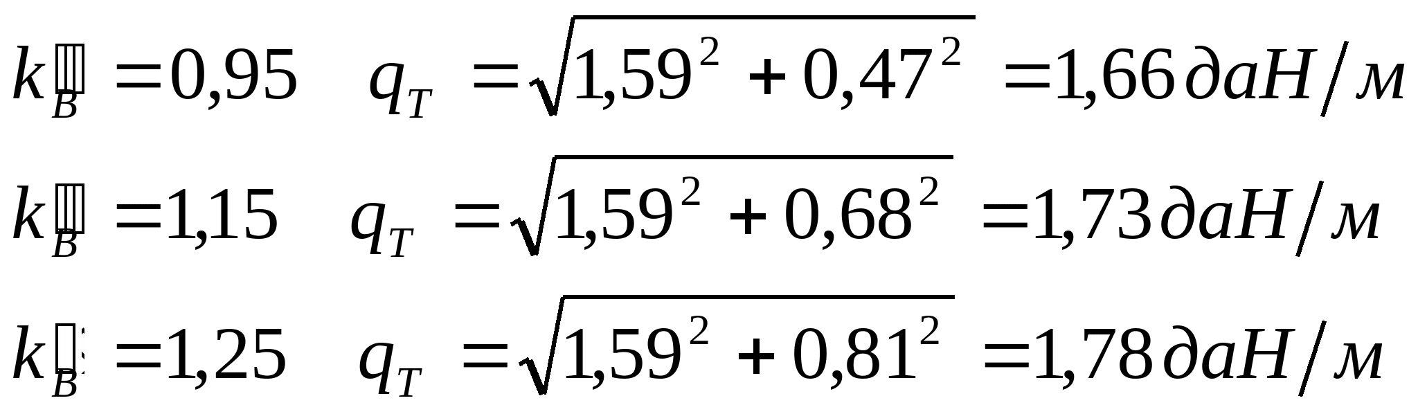 Для главных путей станции и перегона:  Для прочих путей станции  Определение расчетных нагрузок в режиме максимального ветра. Для режима ветра наибольшей интенсивности ветровую нагрузку, даН/м, на несущий трос определяем по формуле: , (3.7) где – аэродинамический коэффициент лобового сопротивления несущего троса; – максимальная скорость ветра, м/с; – диаметр несущего троса. Результирующую нагрузку, даН/м, на несущий трос в режимах максимального ветра находим по формуле , (3.8) где – нагрузка от веса проводов контактной подвески, даН/м; – ветровая нагрузка на несущий трос в режиме максимального ветра, даН/м. Для главных путей станции и перегона ( для троса)