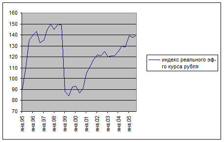 По данным Банка России, реальный эффективный курс рубля ( к корзине валют стран – основных торговых партнеров) укрепился в феврале к январю 2006 года на 2,2%, с начала года 4,5%.[21]