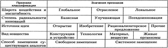 Приведенные классификации свидетельствуют о том, что процессы нововведений многообразны и различны по своему характеру. Следовательно, формы организации нововведений, масштабы и способы воздействия на экономику, а также методы оценки их эффективности тоже должны отличаться многообразием. Используя известные подходы к классификации инноваций, можно построить классификатор, имеющий практическое значение для создания системы управления инновациями (Таблица 2).