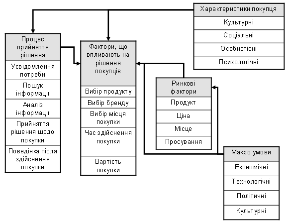 Дослідження споживачів передбачає вивчення структури споживання, рівня забезпеченості товарами, тенденцій споживчого попиту та визначення тих характеристик товару, наявність яких максимально б задовольняла потреби споживача. При цьому важливим є визначення факторів, які відіграють ключову роль під час прийняття рішення споживачем щодо купівлі певного товару за допомогою моделі, зображеної на рисунку 2.2.
