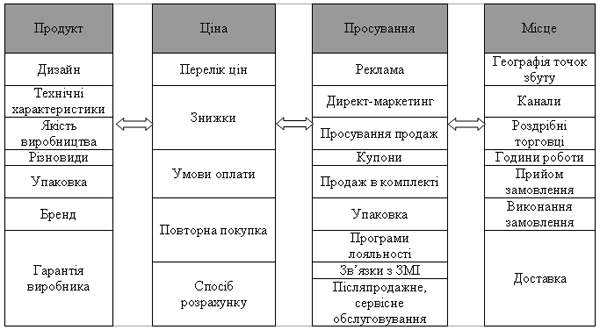Потреби та вподобання групи споживачів, які представляють собою цільовий сегмент, можуть бути задоволені шляхом застосування певних елементів комплексу маркетингу, до яких відносяться продукт, ціна, просування, місце. Основні складові цих елементів представлені на рисунку 2.3.