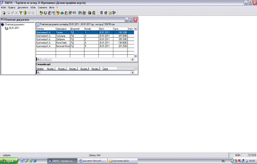 - на екрані з'явиться форма „Платіжні документи: Розділи” та прогрес-бар „Додавання” з видом, номером, датою та сумою документу, на підставі якого додається новий документ. Форма означає звернення з журналу „Прихід товару” до журналу „Платіжні документи” для вибору або створення і вибору відповідного підрозділу для нового платіжного документу у цьому журналі. Очевидно, що журнали пов’язані між собою, і один з документів може бути створеним на підставі іншого з перенесенням частини інформації, що прискорює процеси введення документів і виключає помилки при веденні журналів документів.