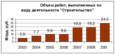 Вывод: Негативное воздействие финансового-экономического кризиса привело к замедлению активности в секторе во второй половине 2008 года, однако сохранилась тенденция ускорения темпов работ в строительстве, поддержанная значительным объемом инвестиций в основной капитал. В 2009 году объем работ, выполненных по виду деятельности «строительство», вырос по сравнению с предыдущим годом на 27,7 % и составил 24,5 млрд. рублей.