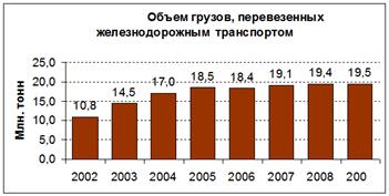 Вывод: в период с 2002 по 2009 г.г. наблюдается увеличение объема грузов, перевозимых железнодорожным транспортом.