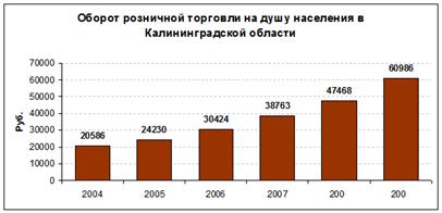 По уровню оборота розничной торговли на душу населения Калининград выходит на среднероссийский показатель с отставанием в один год, что свидетельствует о наличии у региона дополнительного потенциала развития и более широких возможностей для ритейлеров, по сравнению с многими другими российскими регионами.
