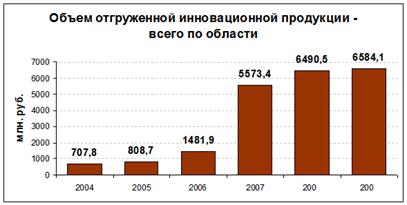 Вместе с тем, в последние несколько лет отдельные показатели в инновационной сфере характеризовались положительной динамикой. Так, например, объем отгруженной инновационной продукции в период с 2004 по 2009 год вырос более чем в 9 раз до 6,5 млрд. рублей.