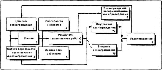 Пунктирная линия между результативностью и внешним вознаграждением означает, что может существовать связь между результативностью какого-либо сотрудника и выдаваемыми ему вознаграждениями. Дело в том, что эти вознаграждения отражают возможности вознаграждения, определяемые руководителем для данного сотрудника и организации в целом. Пунктирная линия между результативностью и вознаграждением, воспринимаемым как справедливое (8), использована для того, чтобы показать, что в соответствии с теорией справедливости, люди имеют собственную оценку степени справедливости вознаграждения, выдаваемого за те или иные результаты. Удовлетворение (9) — это результат внешних и внутренних вознаграждений с учетом их справедливости (8). Удовлетворение является мерилом того, насколько ценно вознаграждение на самом деле (1). Эта оценка будет влиять на восприятие человеком будущих ситуаций.
