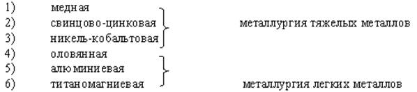 1. Добычу и обогащение рудного сырья (ГОК – горно-обогатительные комбинаты). ГОК базируются у источников сырья, т. к. для производства одной тонны цветного металла в среднем требуется 100 тонн руды.