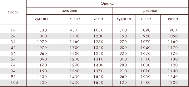 Третий способ, получивший широкое распространение с легкой руки американского врача Купера, написавшего ряд книг об аэробике, состоит в том, чтобы задавать время, а измерять объем работы (дистанцию). Это тест для оценки качества выносливости, которое как раз и характеризует работоспособность. Здесь уже нет того опасного эмоционального компонента, который присутствует в условиях соревнования, меньшее значение имеет способность нервной системы противостоять утомлению при выполнении длительной монотонной работы, как это бывает в случае тестирования по первому способу, особенно в зоне умеренной мощности. Тесты Купера – 6-минутный или 12-минутный бег – позволяют вполне удовлетворительно характеризовать работоспособность человека, измерять предельные возможности его энергетических систем. Эти тесты недаром получили столь широкое распространение: с их помощью можно объективно контролировать собственное состояние и следить за его сдвигами в зависимости от тренировки, утомления и т.п. Нормативы выполнения 6-минутного теста Купера для детей всех классов общеобразовательной школы разработаны кандидатом педагогических наук Г.П. Богдановым (таблица 1). В таблице приведены дистанции, которые должны пробегать учащиеся соответствующих классов, чтобы получить оценку «5», «4» или «3».