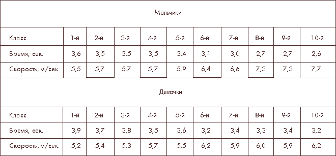 Иногда возникает необходимость оценить максимальную скорость бега. Это особенно важно при спринтерской тренировке, а также для некоторых игровых видов спорта. Здесь в качестве нормативов рекомендуем воспользоваться данными таблицы 2. Проведение такого тестирования требует специальной подготовки дистанции: должны быть размечены отрезок 20 м (скорость на котором идет в зачет), а также дистанция предварительного разбега. Испытуемый при таком тестировании должен разбежаться заранее и пробежать зачетные 20 м уже с максимальной, практически постоянной скоростью. Для регистрации времени бега в этом случае необходим секундомер, тогда как в двух предыдущих случаях можно воспользоваться часами с секундной стрелкой. Приведенные в таблице 2 результаты – средние для соответствующих половозрастных групп, то есть эквивалентны оценке «4» (хорошо).