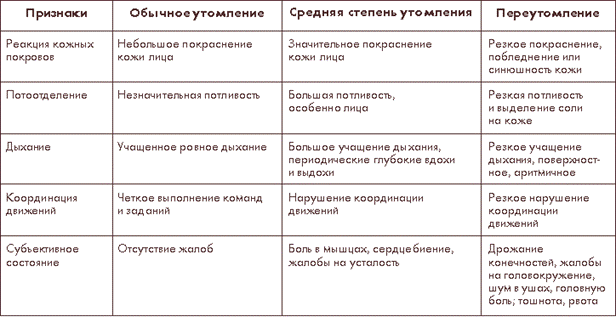Классификация внешних признаков утомления, наиболее удобная при работе с детьми, разработана профессором С.В. Хрущевым (таблица 3). Пользуясь этой классификацией, мы не сможем оценить работоспособность, но по крайней мере будем знать предельные параметры той нагрузки, которая пригодна для данного человека – взрослого или ребенка. Ни в каких случаях не может быть полезной крайняя степень утомления – и, если она однажды была достигнута, нагрузку необходимо снизить как по мощности (интенсивности), так и по объему: перегрузки в тренировках приносят только вред.