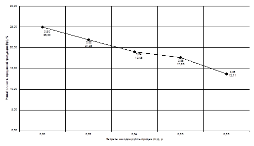 Рисунок Г.2 – График зависимости рентабельности проданной продукции от затрат на один рубль продаж
