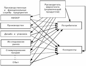 Функциональные руководители наделяются полномочиями по руководству работающими в их сфере сотрудниками и осуществляют контроль за целостностью и полнотой проводимых ими исследовательских, конструкторских и других работ. В целом за счет подобной организации деятельности функциональных руководителей и руководителей программ устраняется большая часть проблем, связанных с отсутствием единоначалия. Матричные оргструктуры управления, как правило, встраиваются в линейно-функциональную структуру управления предприятием в целом. Задача службы маркетинга заключается в том, чтобы держать курс на потребителя, постоянно следить за тем, что ему нужно, проводить мониторинг деятельности конкурентов, определять слабые и сильные их стороны и возможные рыночные действия, а исходя из этого, определять направления совершенствования маркетинговой деятельности, разрабатывать и добиваться выполнения маркетинговых планов и программ, а также доводить маркетинговую информацию до всех других подразделений предприятия. Таким образом, разработчики получают от маркетинговых служб информацию о развитии продукта, о том, в каком направлении нужно совершенствовать выпускаемую продукцию и какую новую разрабатывать. Производственники узнают, каков должен быть ассортимент выпускаемой продукции, каковы сроки ее обновления. Подразделения, связанные с ценовой политикой, исходя из информации, полученной от службы маркетинга, должны уметь правильно определять цены. Кадры, соответственно, решают вопросы увольнения и найма, повышения квалификации и др. В то же время служба маркетинга должна точно представлять возможности предприятия, чтобы, занимаясь его развитием, не оторваться от реальной жизни своей компании. Рассмотренная схема важна как база, основа маркетинговой деятельности. Исходя из этой основы, можно составить также и должностные инструкции. Это не означает, конечно, что производственные и функциональные звенья предприятия самостоятельно не могут осуществлять связь с потребителями, не изучают конкурентов и т.п. Однако эта их деятельность направляется и координируется, с учетом интересов предприятия именно руководителем маркетинговых служб, сотрудники которых проводят также конкретные маркетинговые исследования.
