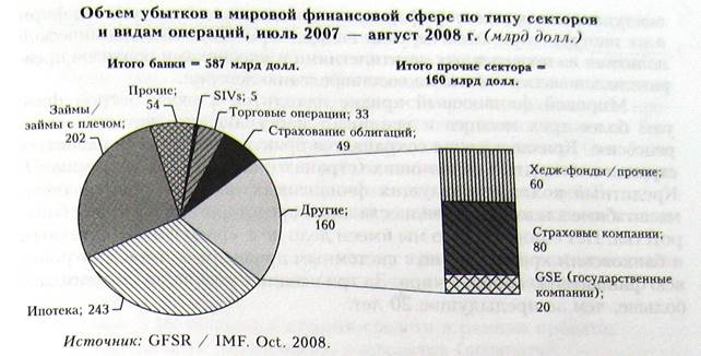 Первый этап кризиса – с июля 2007 до августа 2008 г. – характеризовался развитием американского ипотечного кризиса, списанием огромных средств по «плохим» закладным банками и первыми банкротствами. Только за это время мировая финансовая система понесла потери в сумме примерно до 800 млрд долл. (часть их представлена на рисунке).