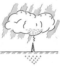 Процесс атмосферного перенапряжения упрощенно можно представить следующим образом. Нижняя часть грозового облака (обычно заряженная отрицательно) и земля образуют своего рода конденсатор с обкладками облако — земля (рис. 1). По мере накопления отрицательных зарядов облака и положительных зарядов земли растет напряженность электрического поля между ними. Когда напряженность в каком-нибудь месте достигает критического значения (25...30 кВ/см), воздух ионизируется и начинается развитие разряда с облака на землю.Рис.1.