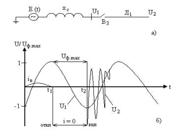 и сопровождается перенапряжением. Перенапряжения на выключателе уменьшаются с увеличением емкости системы.