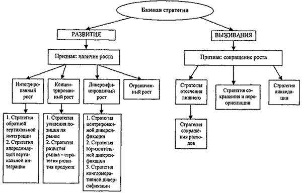 Конкретные стратегии, выбираемые разными организациями, вследствие специфики внешних и внутренних условий, различных взглядов руководства на пути развития организации и др. причин могут существенно различаться. Однако все частные стратегии можно обобщить и вести речь о так называемых базисных, или эталонными стратегиях развития и роста бизнеса и предпринимательства. Эти стратегии касаются всей организации и отражают различные подходы к росту фирмы, связанные с изменением одного или нескольких следующих элементов: