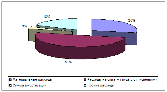 Основная часть затрат приходится на материальные затраты и затраты на оплату труда.
