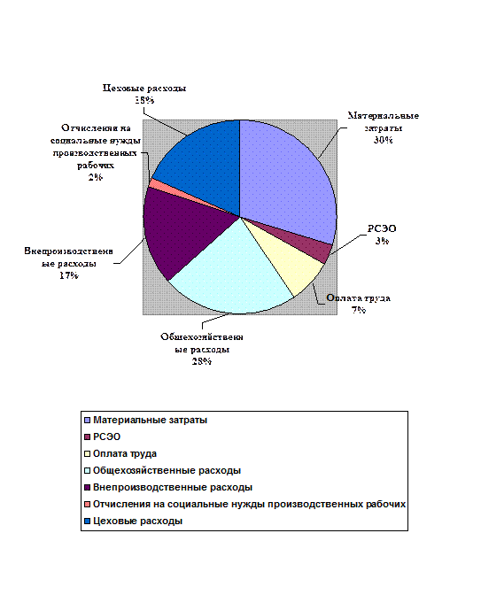 Диаграмма показывает, что большую долю себестоимости изделия составляют материальные затраты (30 %). Чуть меньшую часть себестоимости составили общехозяйственные расходы (28 %) и цеховые расходы (18 %). Также велика доля внепроизводственных расходов (20 %). Удельный вес затрат на оплату труда производственных рабочих, расходов на содержание и эксплуатацию оборудования, отчислений на социальный нужды производственных рабочих составил соответственно 9 %, 4 % и 2 %.