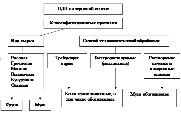 Продукты на зерновой основе вводятся в рацион питания детей первого года жизни. Как основной источник углеводов – крахмала, клетчатки, гемицеллюлозы и т.д. Их товароведная классификация осуществляется по виду сырья, из которого они изготовлены, и способу технологической обработки (рис. 1).