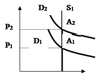 Допустим, что в мгновенном периоде резко повышается спрос. Так как предложение не может в эти же сроки отреагировать на повышении спроса, на рынке произойдет резкое повышение цены – с P1