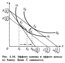 Общий эффект изменения цены распадается на эффект дохода и эффект замены по Хиксу так, как показано на рис. 1.