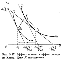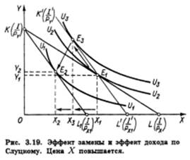 кривой безразличия U3U3, что означает и возможность достигнуть (в случае полной компенсации потребителю падения его покупательной способности) более высокого уровня удовлетворения, чем при использовании модели Хикса. Таким образом, общий результат повышения цены товара X: (Х1 - Х2) разлагается на эффект замены (Х1 - Х3) и эффект дохода (Х3 - Х2). Заметим, что движение от E1 к E2 происходит не вдоль кривой безразличия, как на рис. 1 и 2, а вдоль вспомогательной бюджетной прямой K'L'