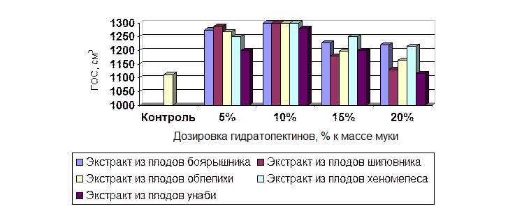 Полученные экспериментальные данные по «силе» и газообразующей способности муки позволили принять технологическое решение о целесообразности использования гидратопектинов в дозировке 10-15 % к массе муки.