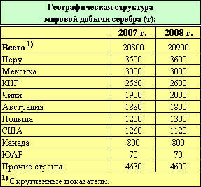 В целом географическую структуру мировой добычи серебра Геологическая служба США оценивает следующим образом (т):