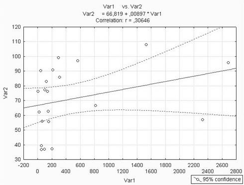 Для анализа влияния «выручки на 100га» и «окупаемости затрат» на рентабельность производства продукции животноводства был использован корреляционно-регрессионный анализ. Корреляционно-регрессионный анализ как общее понятие включает в себя измерение тесноты, направления связи и установление аналитического выражения (формы) связи. Коэффициенты корреляции, представляя количественную характеристику тесноты связи между признаками, дают возможность определять «полезность» факторных признаков при построении уравнений множественной регрессии. Полученное значение коэффициента корреляции (0,30646) указывает на весьма слабую взаимосвязь параметров.