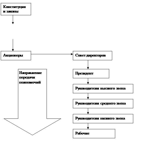 В коммерческом предприятии, например, руководитель отдела кредитования получает свои полномочия от заместителя главного бухгалтера-контролера, а тот – от вице-президента по финансовым вопросам, который, в свою очередь, от президента, получающего полномочия от совета директоров. Если проследить дальше, совет директоров получает полномочия от акционеров, обладающих своими полномочиями, предоставленными институтом частной собственности в соответствии с конституцией и законами страны. Это представляется логичным и согласующимся с концепцией делегирования полномочий руководителями их подчиненным.