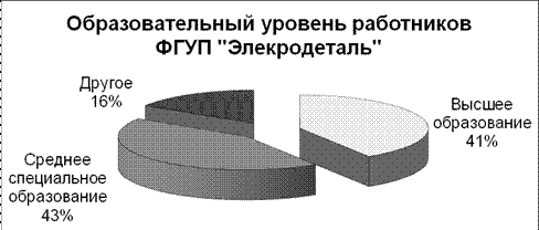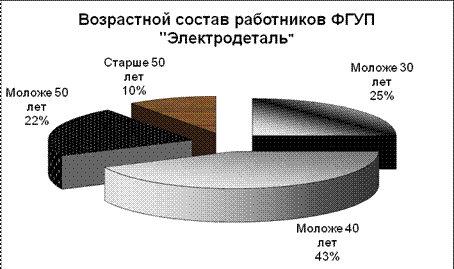 Численность работающих на предприятии — 1700 человек. Средняя заработная плата 4 тыс.руб. 41% работающих имеют высшее образование и 43% среднее специальное образование. Это говорит о достаточно высоком уровне работников предприятия. Кадровый состав предприятия достаточно молодой: 25% работников моложе 30 лет и 43% работников моложе 40 лет.