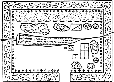 Полевая ремиза. 1 - защитная полоса из лиственных деревьев и кустарников; 2 - полоса высокостебельчатых трав; 3 - водоем; 4 - купы кустов разных пород; 5 - кормушки для зайцев; 6 - посевы кормовых культур; 7 - кормушки для пернатой дичи; 8 - стожки сена; 9 - порхалища; 10 - галечники.