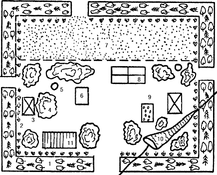 Лесная ремиза. 1 - защитная полоса из лиственных и хвойных пород; 2 - полоса высокостебельчатых трав; 3 - кормушки для птиц; 4 - купы кустов разных пород; 5 - солонцы; 6 - порхалища; 7 - посевы кормовых культур; 8 - кормушки для копытных; 9 - галечники; 10 - водоем; 11 - навесы-укрытия для копытных.