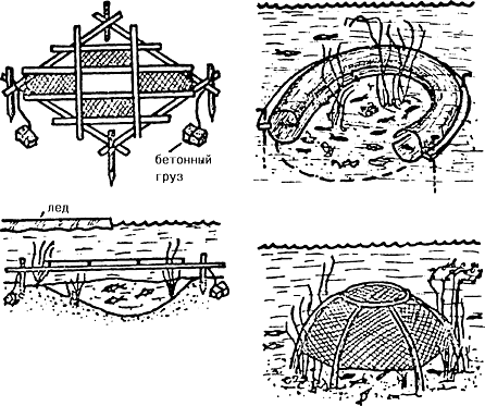 Можно для рыб сделать и такие <дома>. Для этого еще зимой заготовьте еловые жерди, очистите их и просушите. Сделайте гирлянды из веничков, закрепив их на расстоянии 20-30 см один от другого. Материалом для веничков могут быть лапки ели, мох-сфагнум, пучки соломы, тростника, камыша и т.д.
