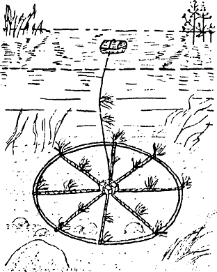 Основой их являются длинные прутья гнущихся пород деревьев, кустарников. Из прутьев связывают круг диаметром 0,5-1 метр. По диаметру располагают скрепляющие прутья. По поверхности круга крепят венички, а к его центру - груз и подвязывают веревку с буйком. По буйку и определяется, где стоит сделанное вами нерестилище. Несколько таких нерестилищ обычно устанавливаются вместе.