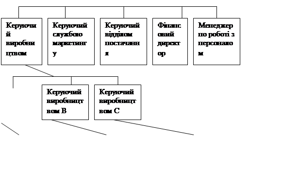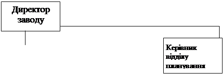 Схема 2. Організаційна структура управління на Рубежанському хімічному заводі „Заря”. Примітка: знаком „ | ” позначаються лінійні зв’язки. Всі інші зв’язки — функціональні.