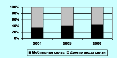 В 2006 году продолжилась тенденция перетекания трафика из фиксированных сетей в мобильные, что выражается в возрастании удельного веса доходов от мобильной связи (основную долю которых составляют доходы от сотовой связи) в общих доходах от телекоммуникационных услуг в республике. Удельный вес доходов от мобильной связи вырос с 35% в 2004 году до 45% в 2006 году (Рисунок 1).