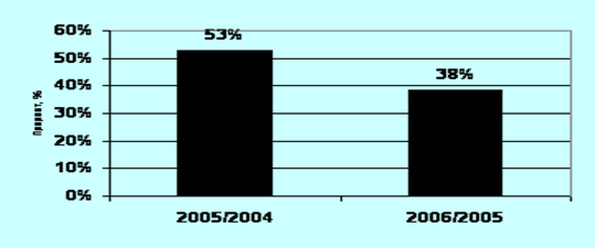 В денежном выражении объем доходов в сфере мобильной связи в 2006 году увеличился на 38% по сравнению с 2005 годом. Это меньше, чем в 2005 году, когда прирост доходов от мобильной связи по сравнению с 2004 годом превысил 50% (Рисунок 2).