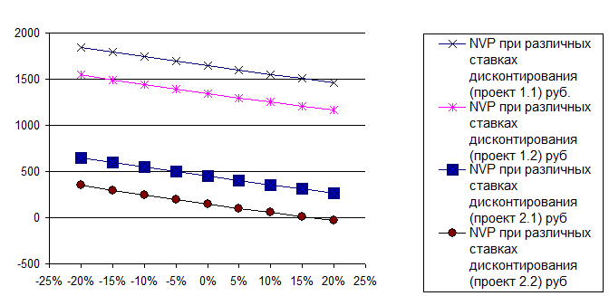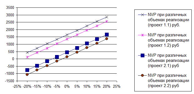 Влияние фактора товарооборот в 6,4 раза значительнее, чем влияние ставка дисконтирования. Такая динамика характерна для всех четырех проектов.(таблица 2.5) Если сравнить показатели четырех проектов между собой, то можно отметить что наименьшая чувствительность к изменению NVP у первого и второго проекта (инвестиции 854 и 1154 тыс. руб. при условии аренды помещения). У третьего и четвертого проектов (инвестиции 2049 тыс. руб. и тыс. руб. соответственно, условия покупки помещения) чувствительность выше, чем у первого в 3,6 и 11 раз соответственно.