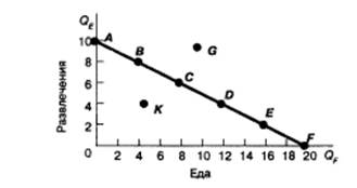 Прямая AF представляет собой бюджетную линию потребителя при заданном доходе в размере 100$, цене развлечений в 10$, и цене еды в 5$ . Линия AF показывает возможные потребительские пары (такие как А,В, С), которые охватывают весь бюджет потребителя, который не может позволить себе комбинации благ, показанные точками, лежащими выше и правее линии (G). Точки, находящиеся внутри бюджетной линии, как, например, K, являются допустимыми, но лежащие на бюджетной линии точки позволяют ей купить больше обоих благ, чем она купила бы в точке K.